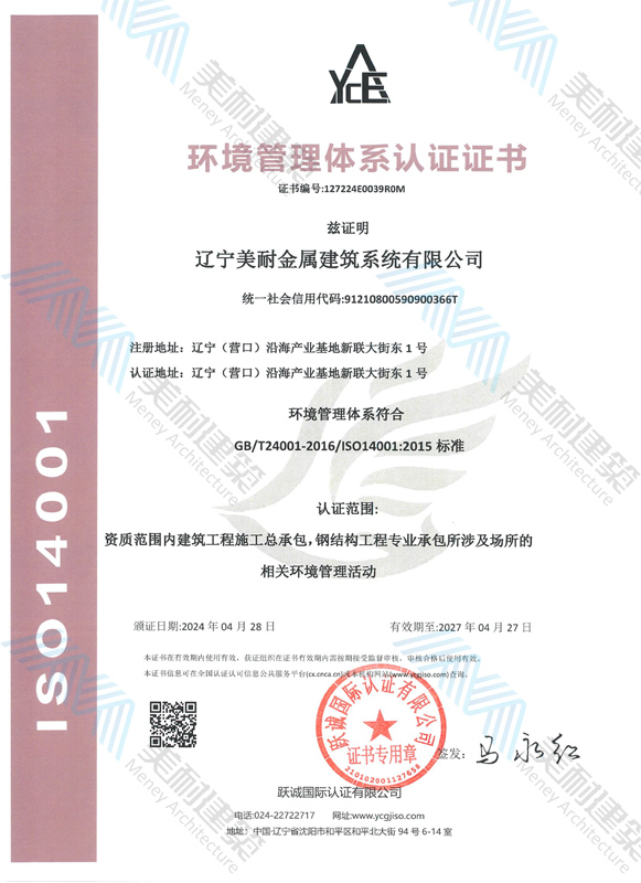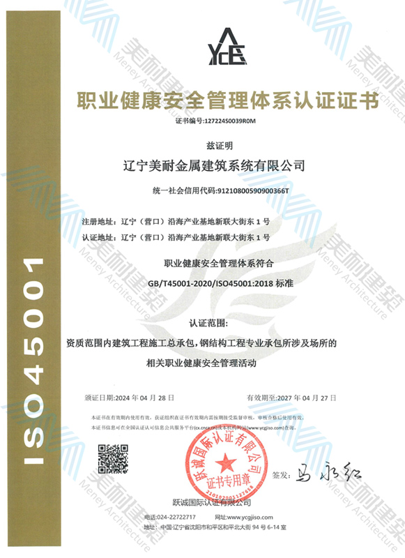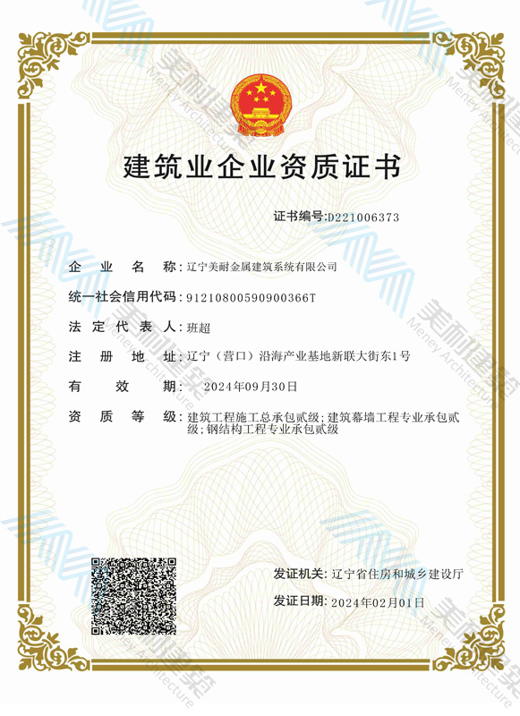 遼寧美耐金屬建筑系統(tǒng)有限公司位于遼寧(營(yíng)口)沿海產(chǎn)業(yè)基地,專注于預(yù)制金屬建筑系統(tǒng)領(lǐng)域,是一家集工業(yè)建筑設(shè)計(jì)、制作、施工及相關(guān)的技術(shù)咨詢與服務(wù)為一體的綜合性服務(wù)企業(yè)。作為國(guó)家鋼結(jié)構(gòu)協(xié)會(huì)會(huì)員、中國(guó)建筑金屬結(jié)構(gòu)協(xié)會(huì)會(huì)員單位與國(guó)家高新技術(shù)企業(yè),美耐建筑集建筑工程施工總承包、鋼結(jié)構(gòu)工程專業(yè)承包等多種資質(zhì)于一身,并擁有22項(xiàng)鋼結(jié)構(gòu)建筑領(lǐng)域?qū)@?項(xiàng)軟件著作權(quán)。